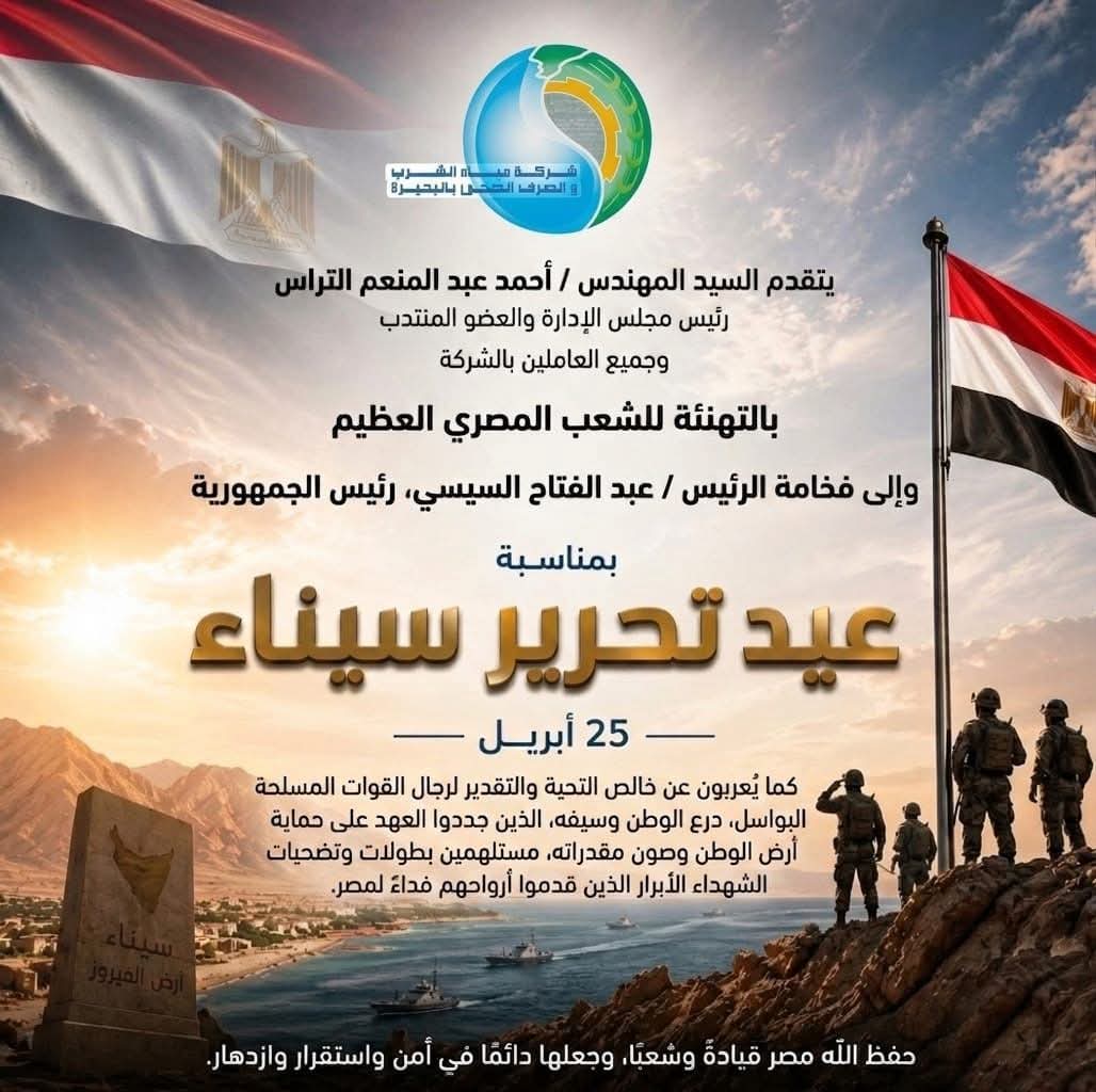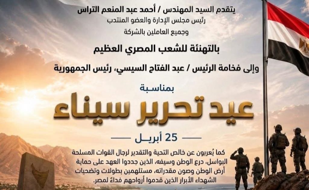 يتقدم السيد المهندس احمد التراس رئيس مجلس الإدارة والعضو المنتدب وجميع العاملين بالشركة بالتهنئة للشعب المصري العظيم والى فخامة الرئيس عبدالفتاح السيسي رئيس الجمهورية بمناسبة عيد تحرير سيناء أبريل 25, 2026