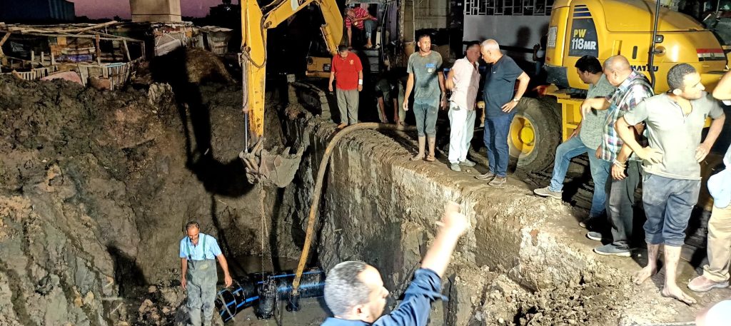 وسط موقع شديد الصعوبة وتحديات فنية كبيرة، يواصل رجال شركة مياه الشرب والصرف الصحي بالبحيرة أعمال إصلاح الكسر المفاجئ بخط المياه الناقل قطر 710 مم، أسفل كوبرى السعرانية بكفر الدوار، دون توقف أو راحة.