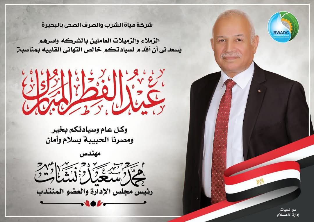 السيد المهندس محمد سعيد نشأت رئيس مجلس الإدارة والعضو المنتدب يهنئ جميع العاملين وأهالي البحيرة بحلول عيد الفطر مبارك ومصرنا الحبيبة بسلام وأمان مارس 30, 2025