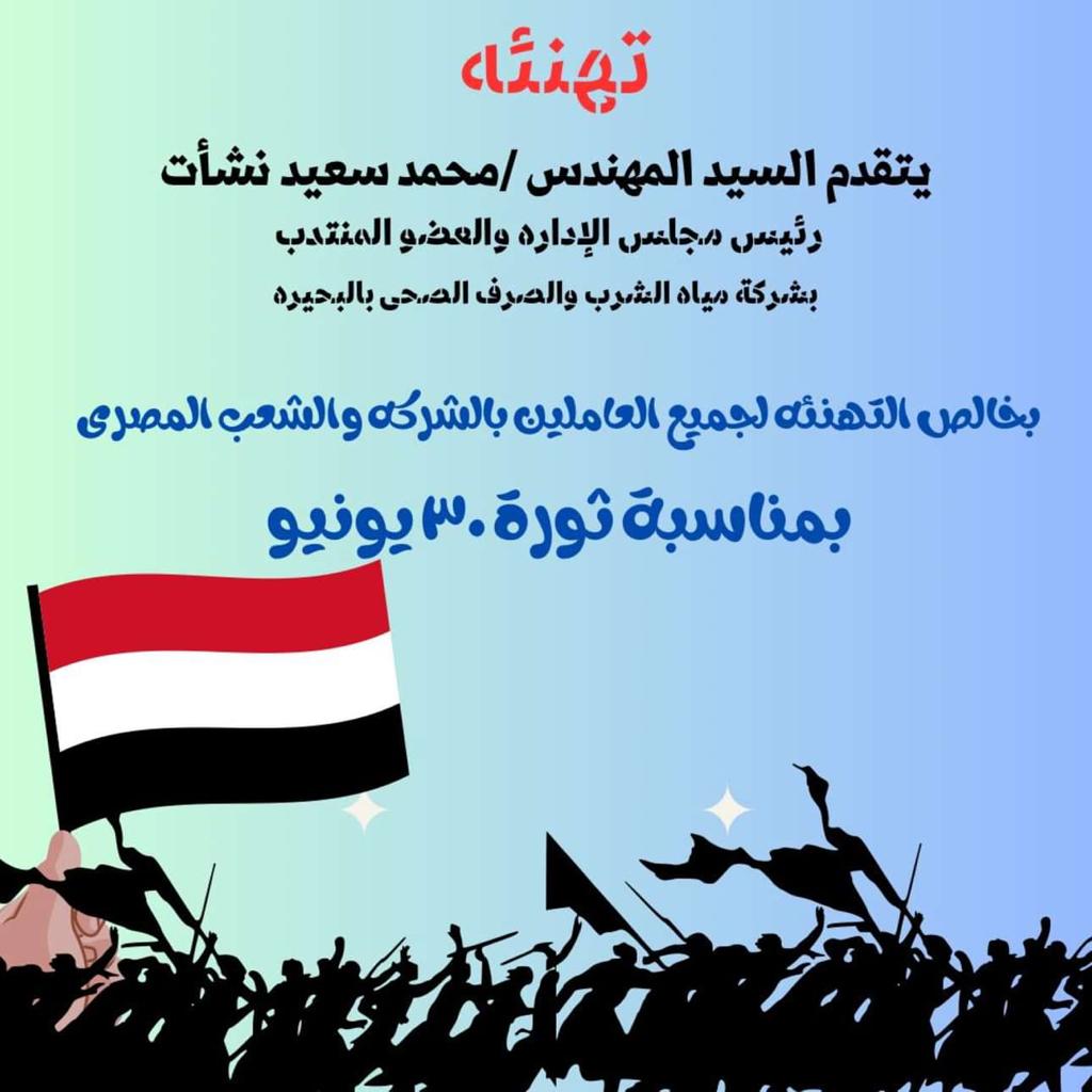 يتقدم السيد المهندس / محمد سعيد نشأت رئيس مجلس الإدارة والعضو المنتدب بخالص التهنئة للعاملين بالشركة والشعب المصري بمناسبة ثورة 30 يونيو يونيو 30, 2023